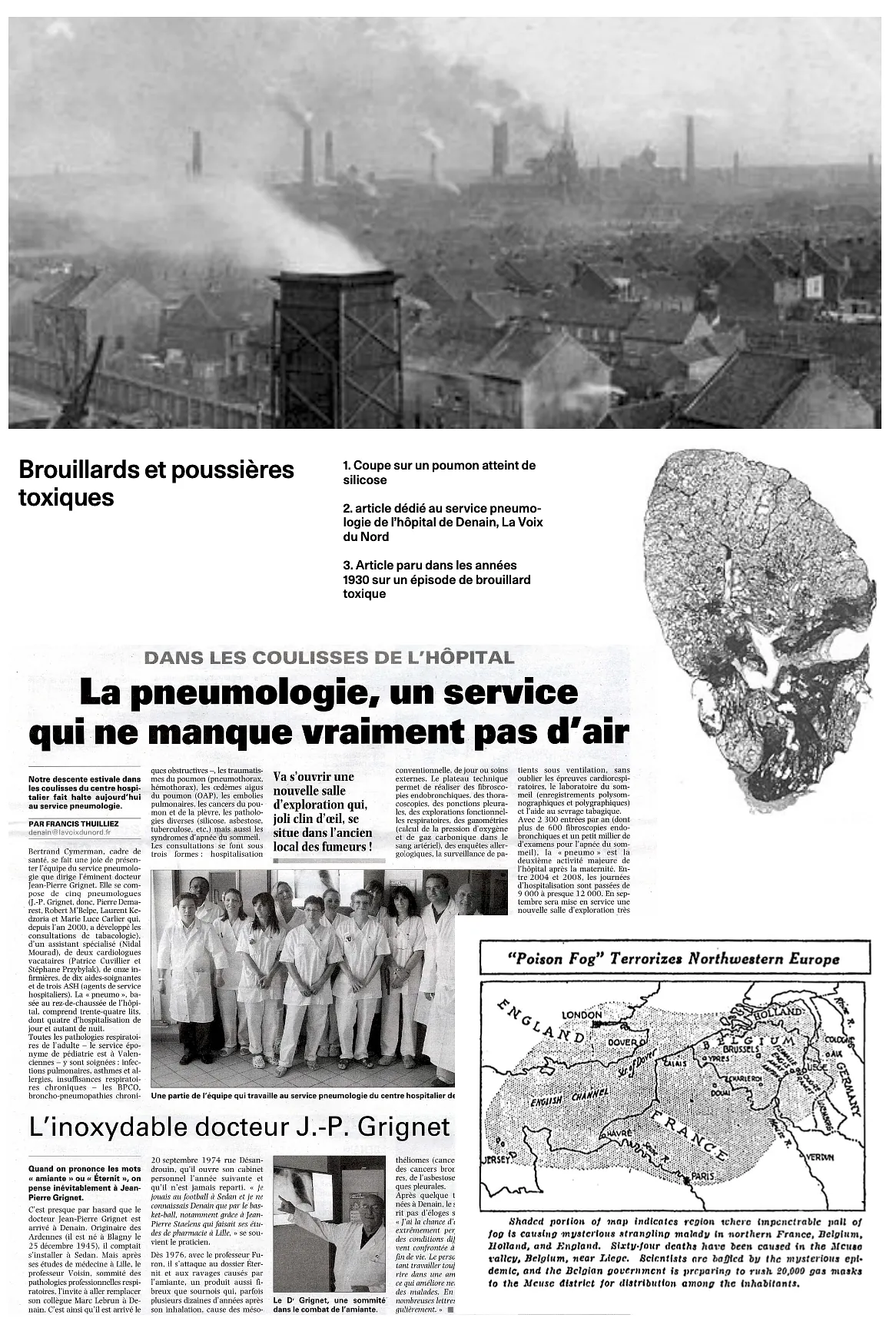 L’immersion dans l’hôpital de Denain commence dans la salle polyvalente Jean-Pierre Grignet, figure et ancien chef du service de pneumologie, qui a traité au début de sa carrière de nombreux anciens mineurs atteints de silicose. Cette maladie liée à l’inhalation de poussières minérales en suspension dans l’air a tué en France plusieurs dizaines de milliers de travailleurs depuis 1945, et a notamment été accentuée avec l’arrivée du marteau-piqueur dans les mines.