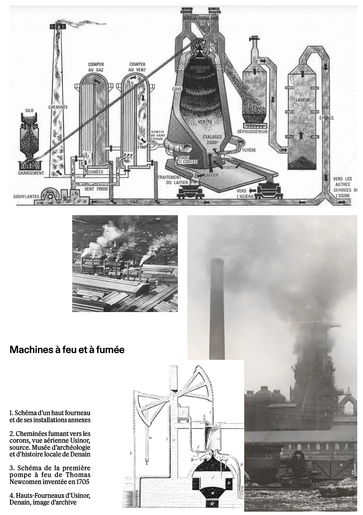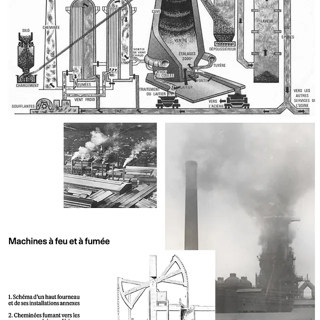 En 1828, un filon de charbon gras est découvert à la fosse Villars. Avec une meilleure concentration en carbone et potentiel de combustible, 15 fosses sont ouvertes en moins de 30 ans et la métallurgie prend son essor dans la région, dans les pas des industries du Borinage belge. En 1837, une première usine à fer appelée les Forges de Denain s’installe et les coulées de fonte commencent à teinter le ciel de leurs feux et leurs fumées. Aujourd’hui encore, partout où nous allons il y a presque toujours une affaire de combustion : coulées, cornus, charbon, cheminées, terrils. Nous héritons d’un paysage “vulcanisé”, où les fumerolles s’échappent encore du terril Renard, qui n’a pas achevé sa combustion, mais où le feu des coulées de fonte, autrefois visible de loin la nuit, à disparu. Jules Mousseron (1868-1943), poète et mineur de fond pour la compagnie des mines d’Anzin, appelait Denain “La Ville Feumière”.