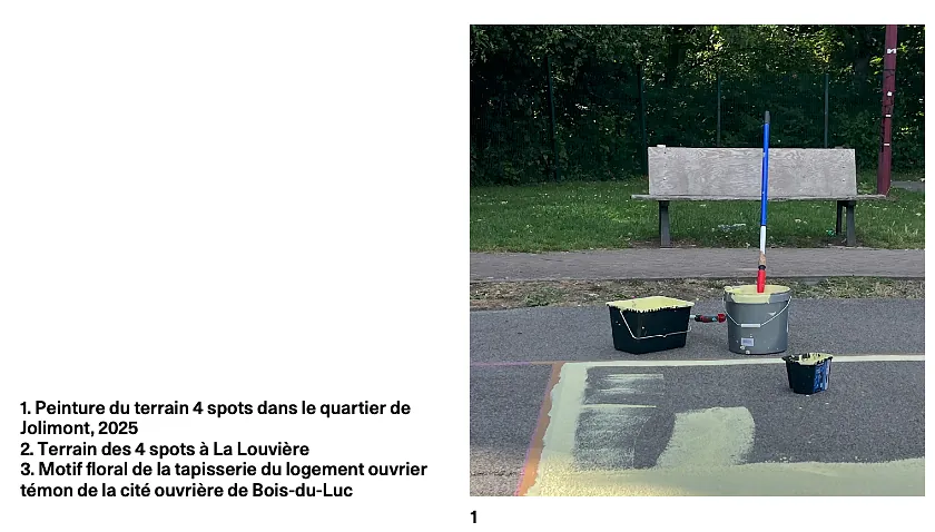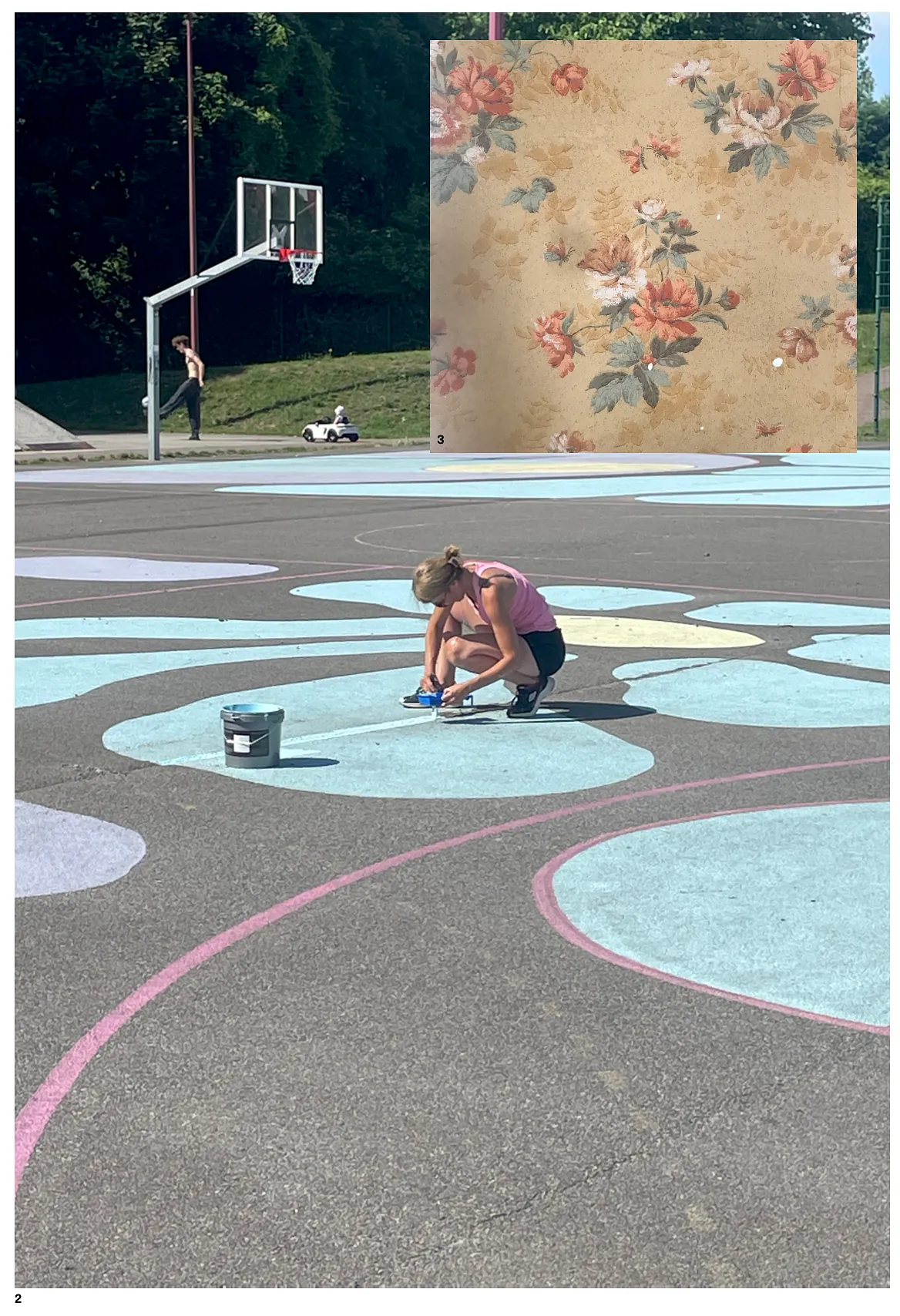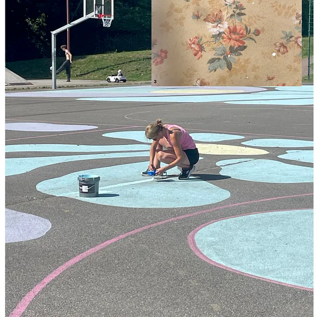 Dans notre boucle d’enquête, une dernière rencontre marque nos esprits par l’usage qui est fait du motif floral pour aménager un lieu. Ici, le jardin est une image, une évocation. Il n’est cependant pas dénué de pratique propre à son entretien. À l’initiative d’un citadin, le terrain de sport délaissé du square de Jolimont est lauréat d’un budget participatif qui permet de pérenniser l’action qu’il a entreprise de tracer les lignes d’un terrain de basket, auquel s’ajoute un décor floral. Par l’aménagement qu’il en fait, le terrain sport retrouve sa vitalité d’antan lorsque l’espace était pratiqué de manière régulière par les joueurs, les enfants et les voisins du quartier, en cela il
