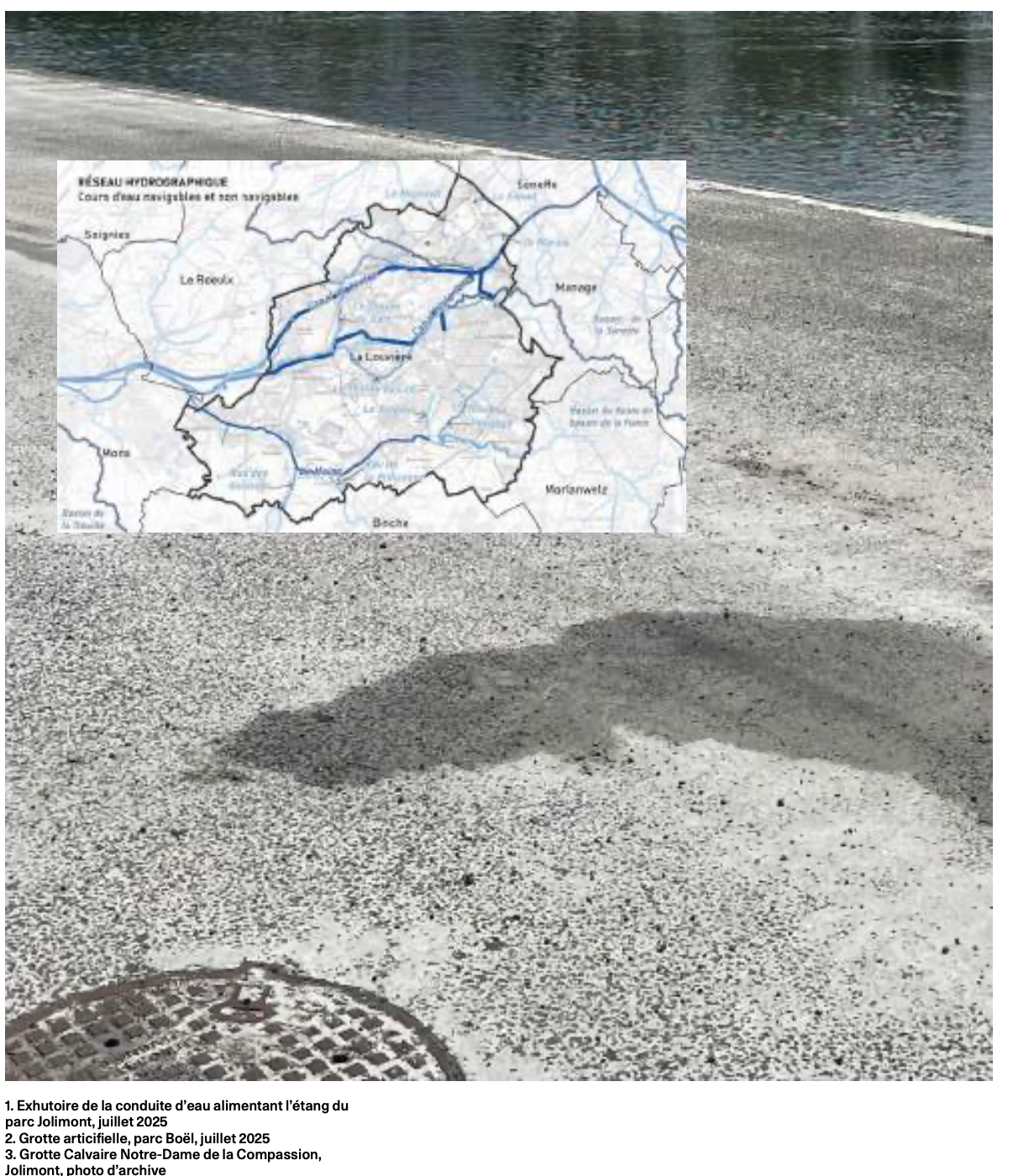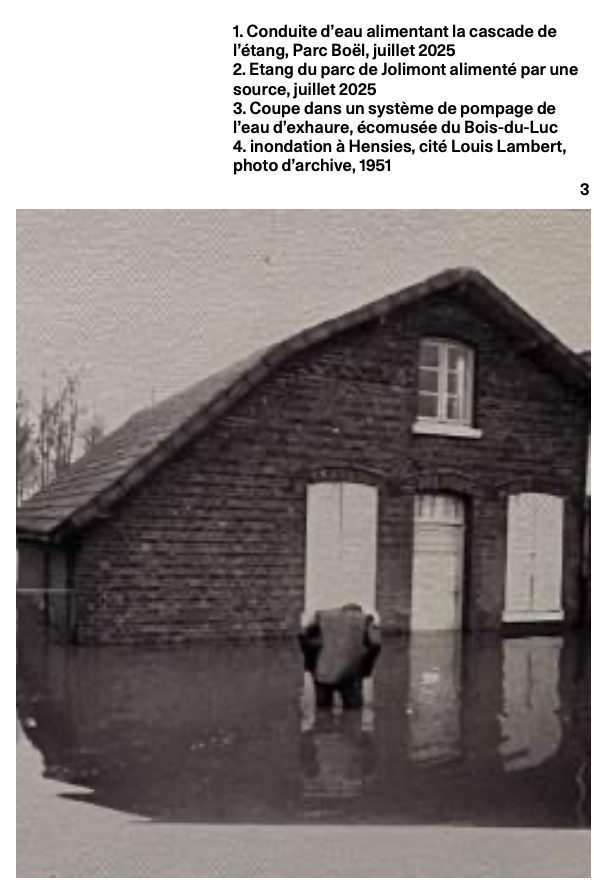 Au-delà de cette infrastructure hydraulique remarquable, partout où l’on va à La Louvière, il y a des résurgences de l’eau, des systèmes hydrauliques oubliés, des eaux souterraines qui refont surface, qui mettent au jour l’histoire d’une relation moins visible à l’eau et non moins structurante dans la vie des territoires : eaux souterraines, zones inondables, eaux d’exhaure, rivières artificielles, sources et cascades de domaines boisés, ruisseaux pollués canalisés...
