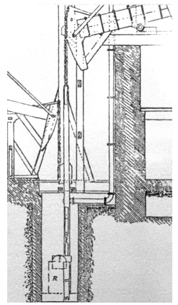 «En surface, entre de puissantes solives de chêne, le gigantesque balancier de la machine d’exhaure, aujourd’hui disparue, actionnait une maîtresse tige entraînant les pompes étgées dans le puits. Elle assure l’exhaure de plusieurs fosses de Bois-du-Luc jusqu’en 1914, moment où ce système fut remp)lacé par deux pompes à -420m, et recueillant l’eau du bougnou (puisard). Jusqu’à la fermeture de Saint-Emmanuel, en 1959, une partie de l’eau pompée était envoyée dans un bac installé en toiture et servant de château d’eau pour les bains-douches du personnel.»